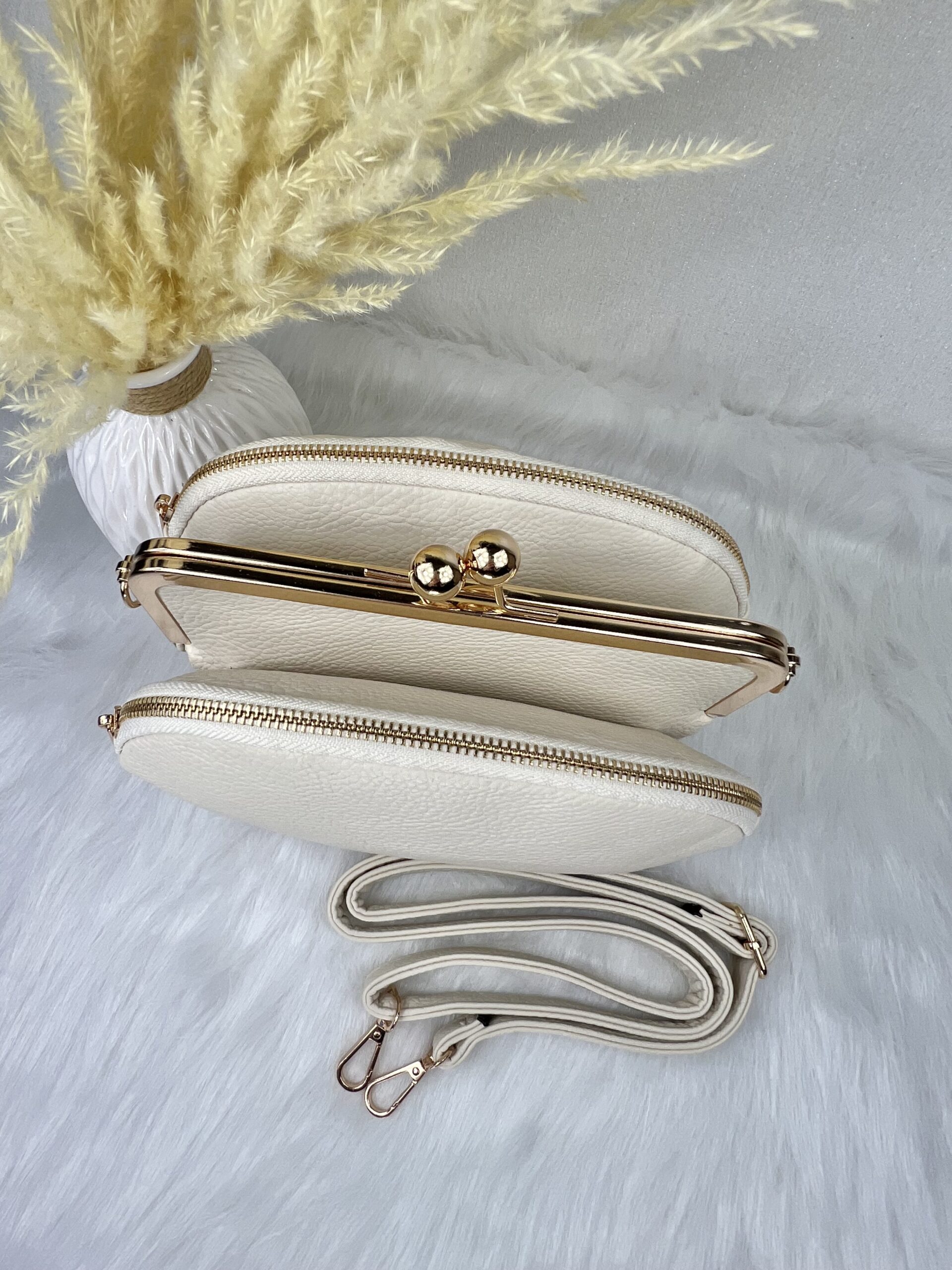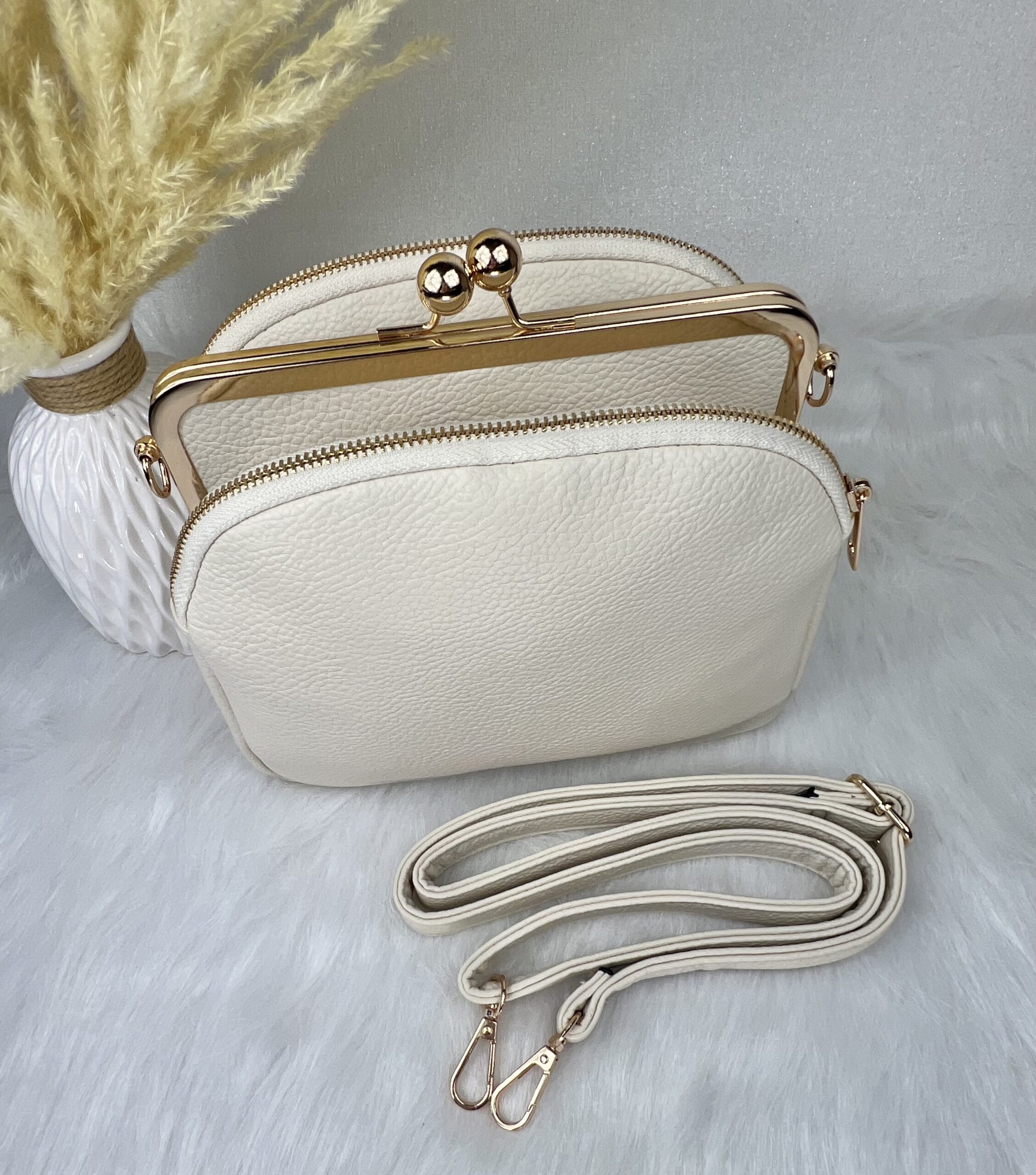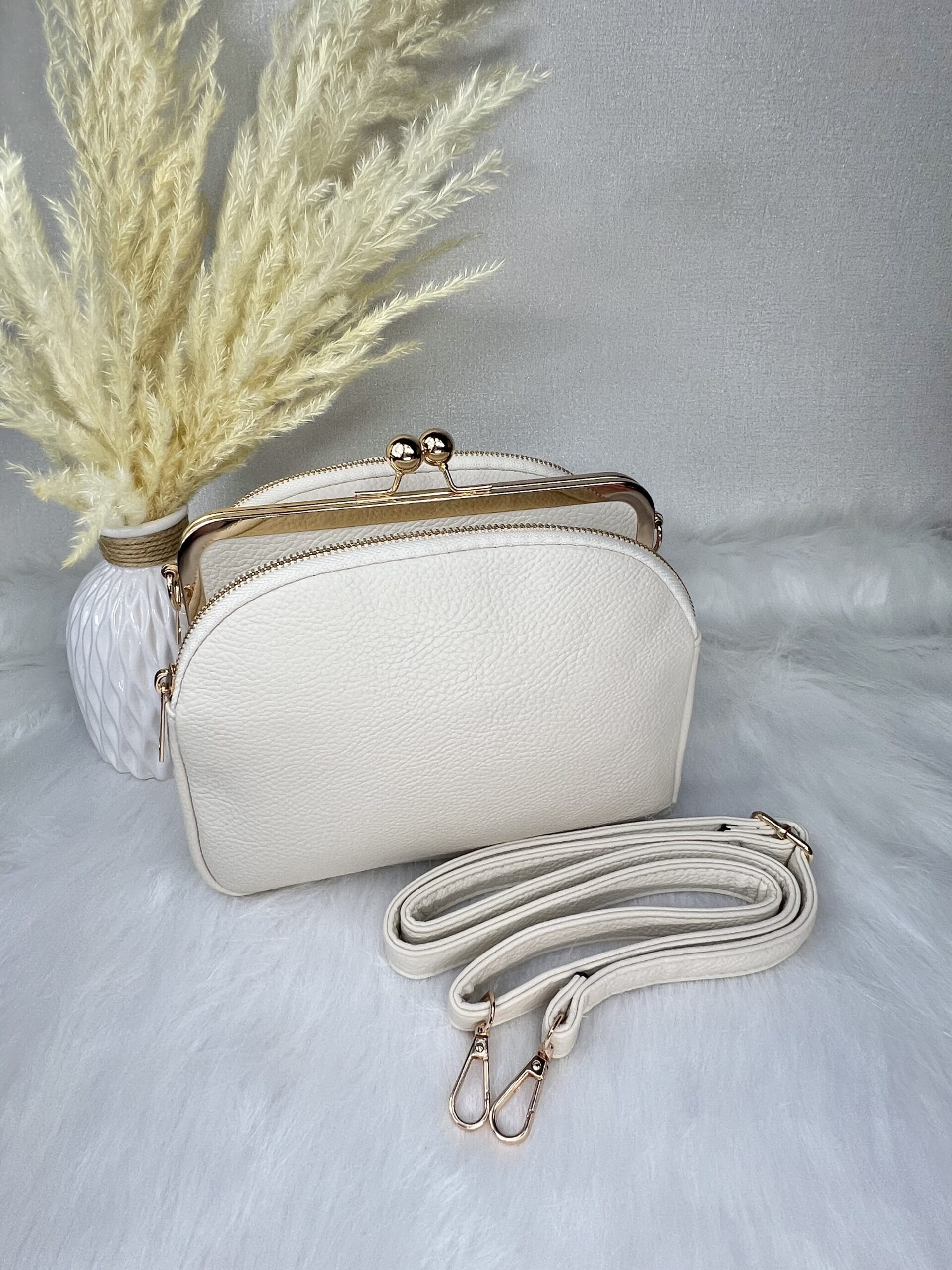 Retro stiilis kuldsete metallist detailidega crossbody kott.