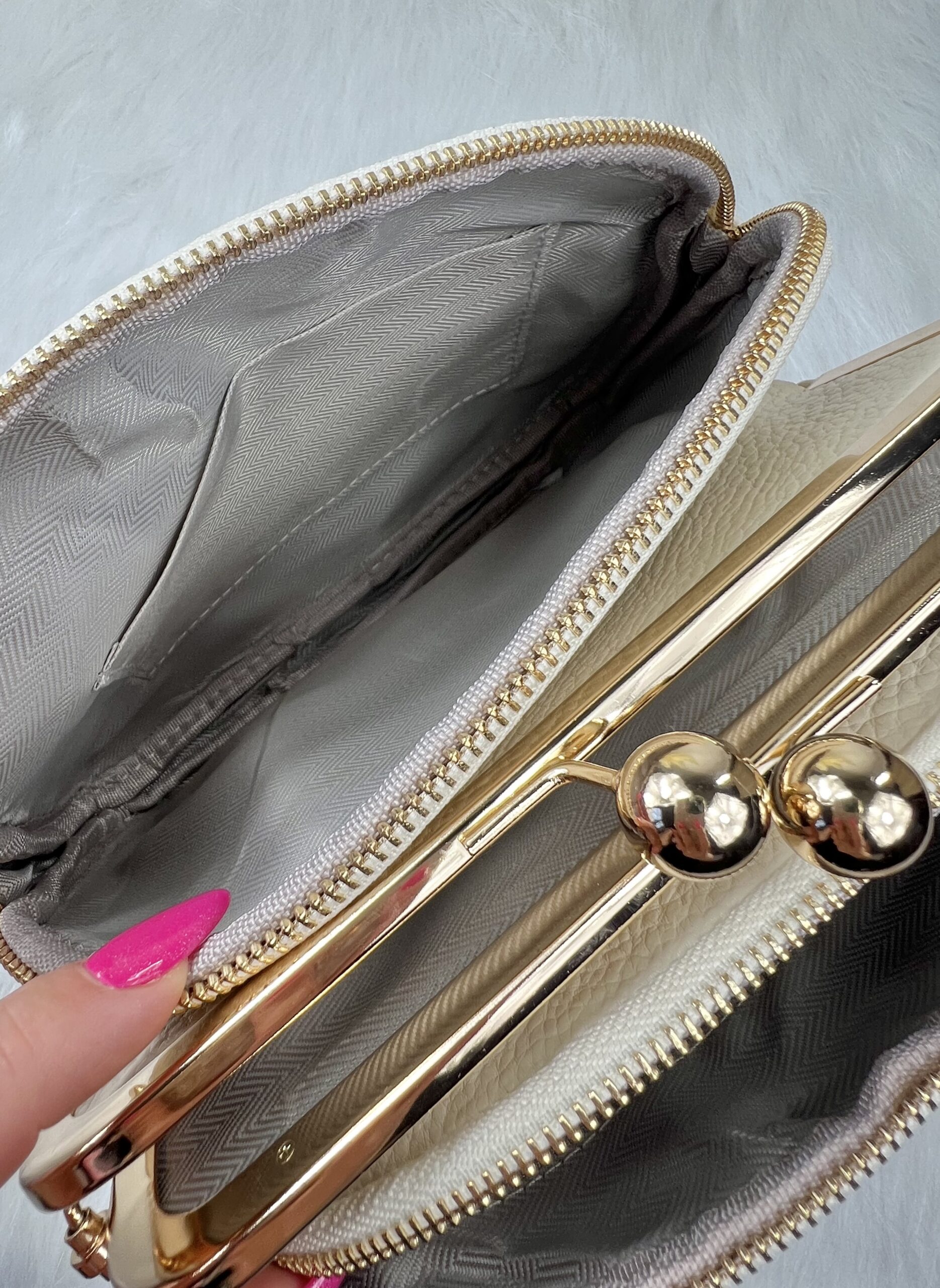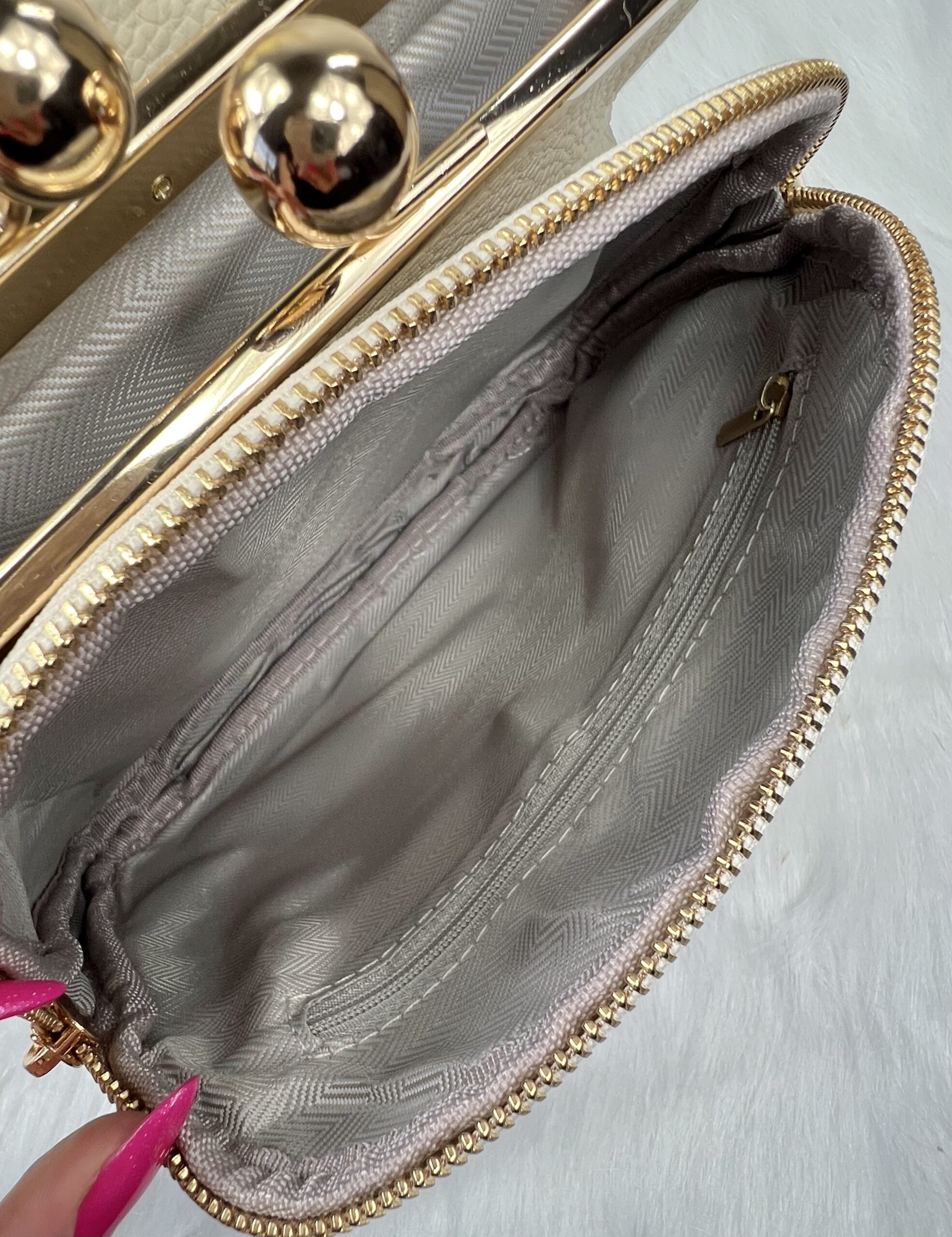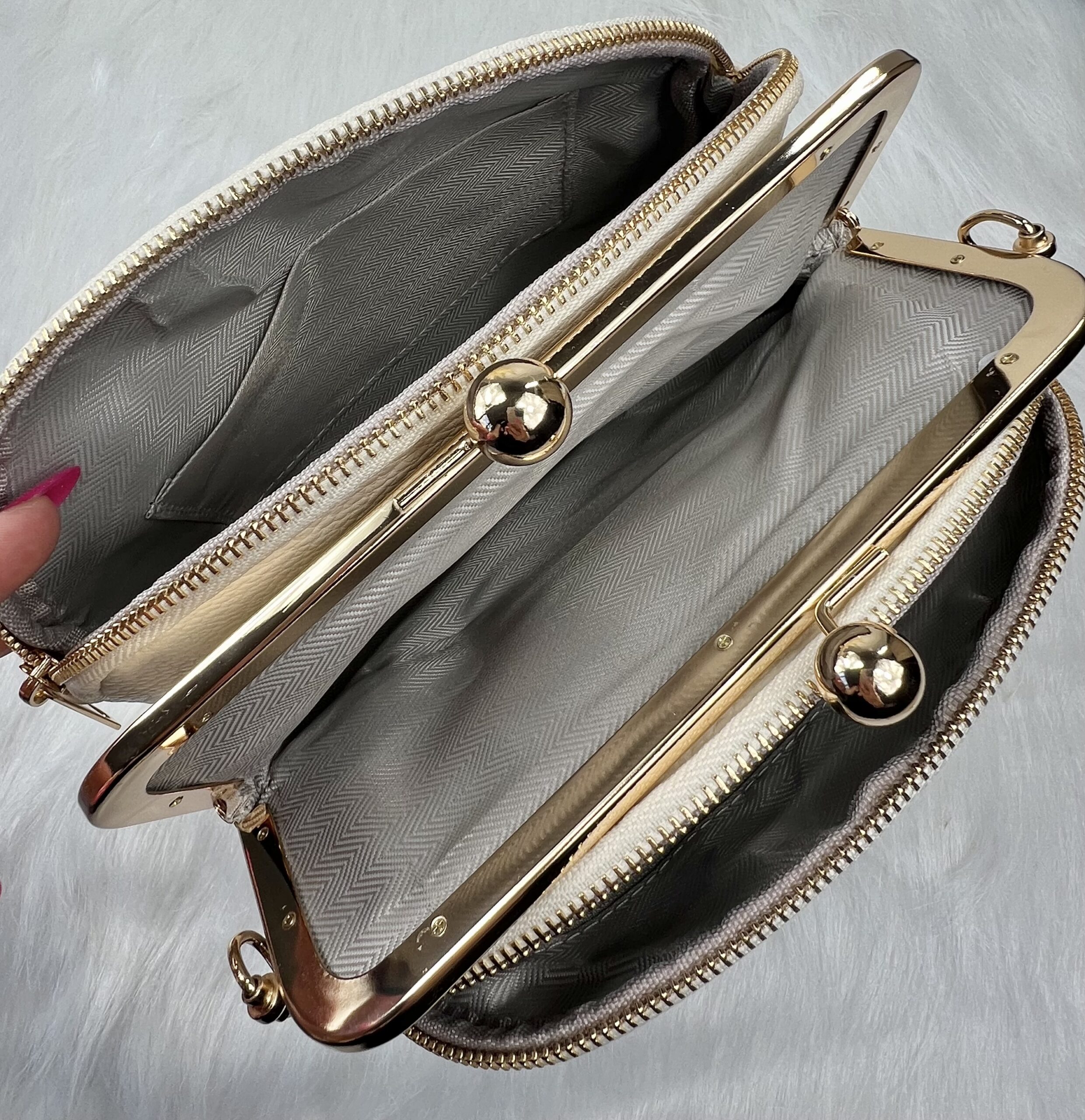 Retro stiilis kuldsete metallist detailidega crossbody kott.
