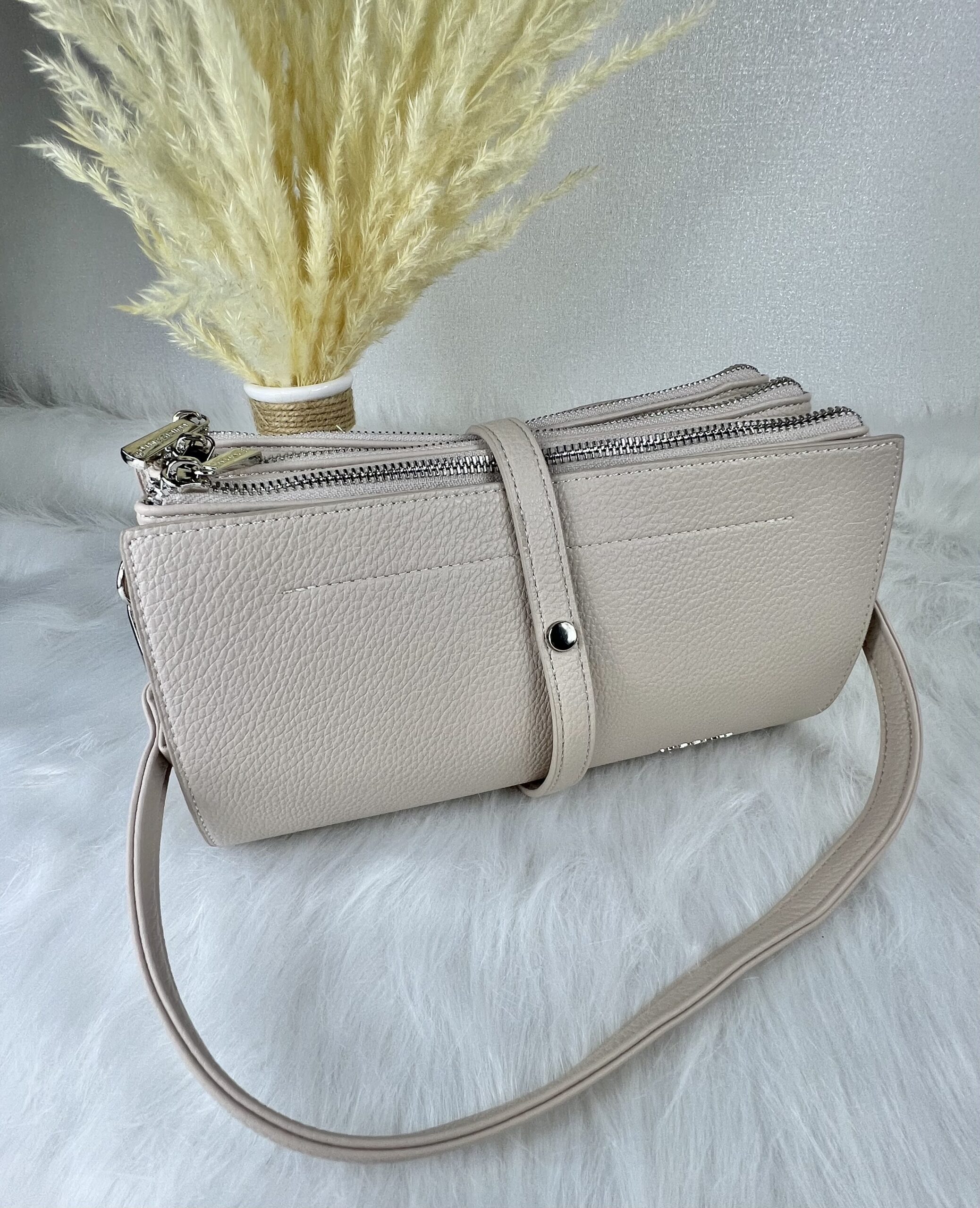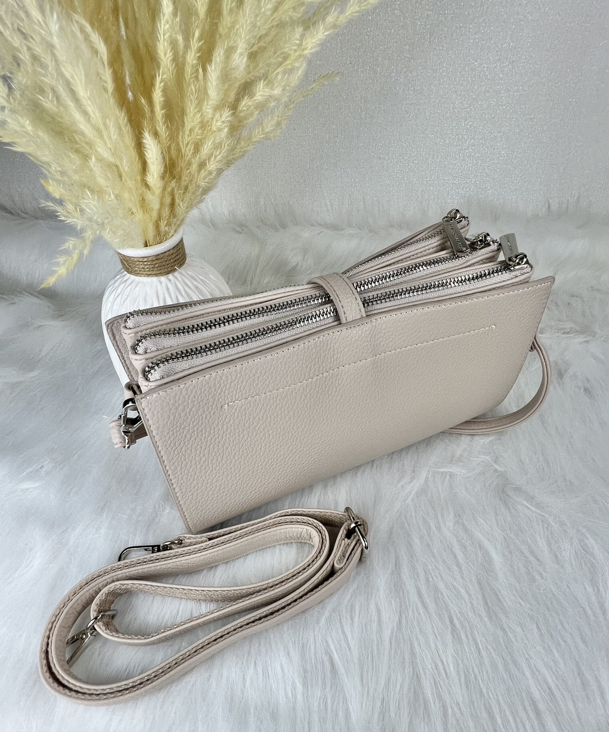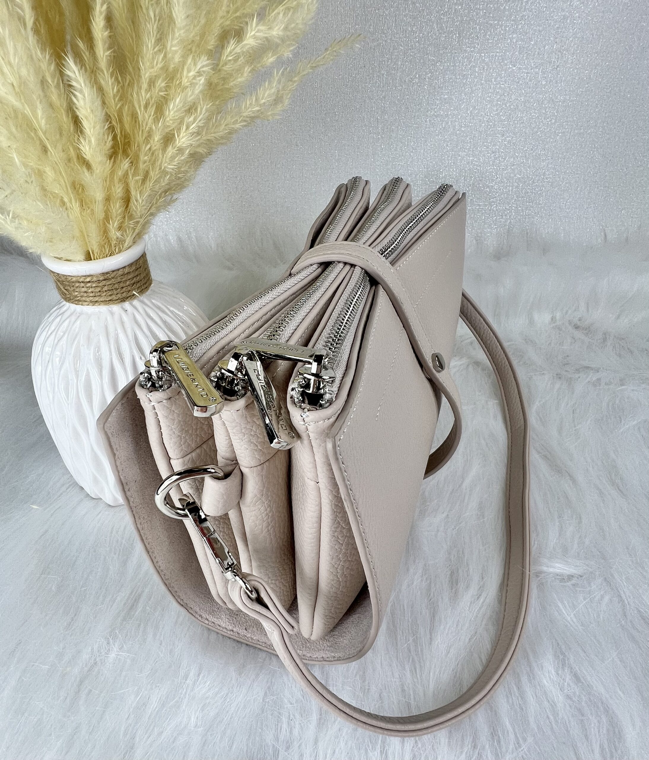 Pehme ja stiilne beež kott, mis hoiab kõik vajalikud asjad ilusti korras.