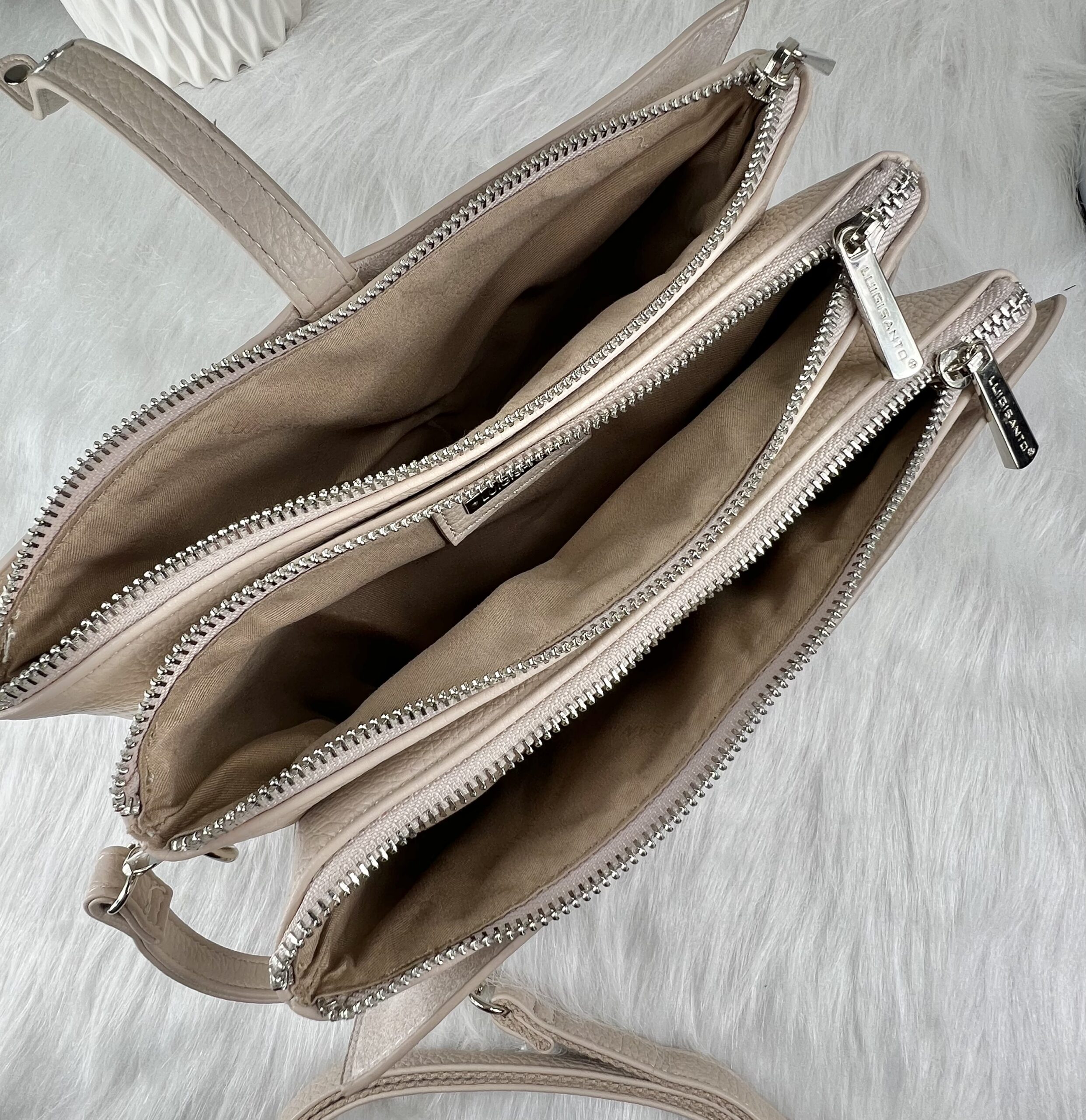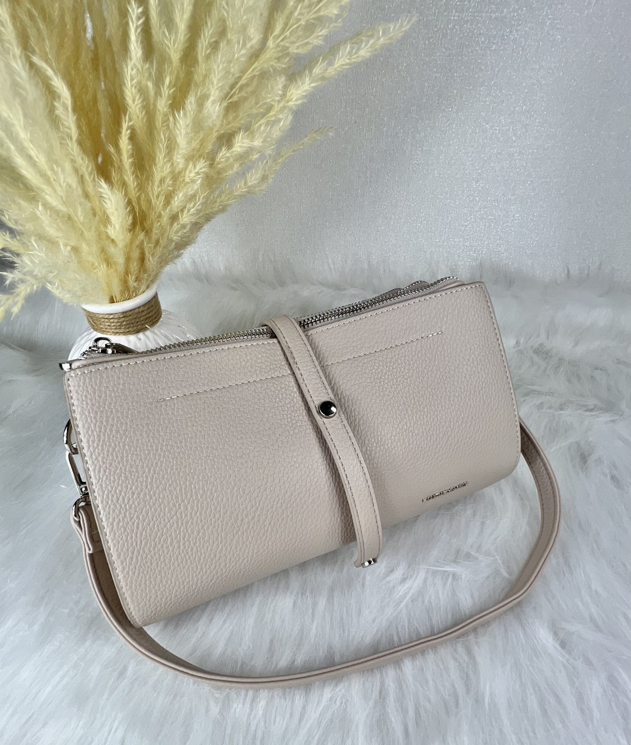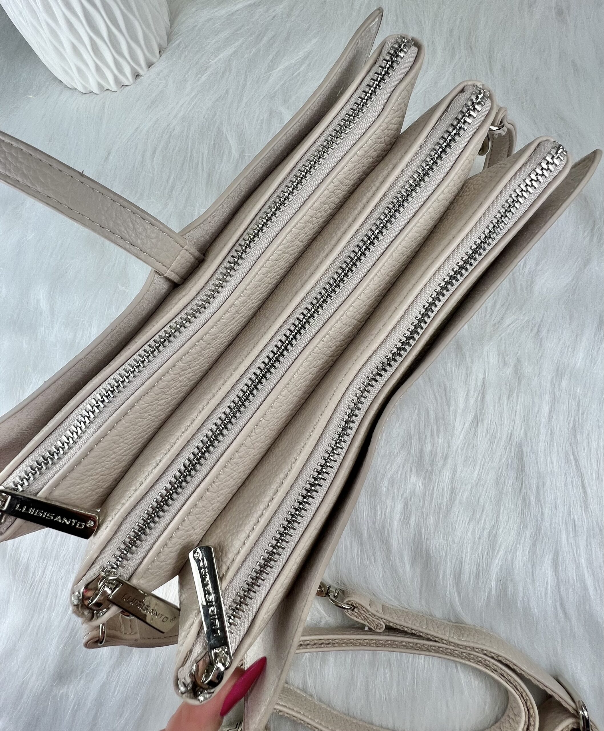 Pehme ja stiilne beež kott, mis hoiab kõik vajalikud asjad ilusti korras.